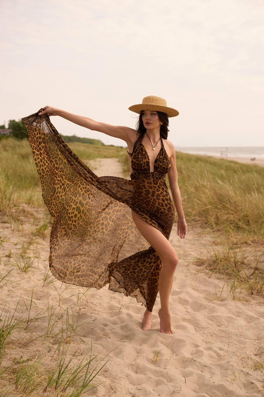 A long leopard-print dress with a train made of semi-sheer silky polyester.